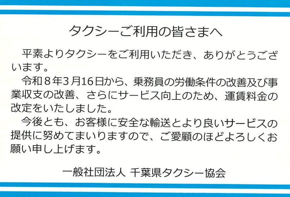 NEWS 2月12日タクシードライバー合同就職説明会参加 2025年2月1日 いつも八千代タクシーをご利用いただき誠にありがとうございます! 千葉県タクシー協会京葉支部主催 タクシードライバー合同就職説明会に参加いたします! https://www.taxichiba-keiyo.jp/session.html 日時:令和7年2月12日(水)12時30分~16時 場所:ハローワーク船橋 第一庁舎...
